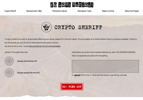 No More Ransom! 的 Crypto Sherief 加密檔案自我檢測(cè)平臺(tái)相當(dāng)厲害,可能是目前網(wǎng)路唯一提供這項(xiàng)服務(wù)的網(wǎng)站!簡(jiǎn)單來說,使用者只要點(diǎn)選左側(cè)兩個(gè)按鈕將被加密的任一兩個(gè)檔案選取、上傳,右側(cè)則是填入你在支付贖金頁(yè)面看到的 Email、網(wǎng)址,這部分需要確認(rèn)無誤,以避免找不到可以解密的金鑰或工具,你也可以直接上傳勒索病毒留下來的訊息(.txt 或 .html 格式)。