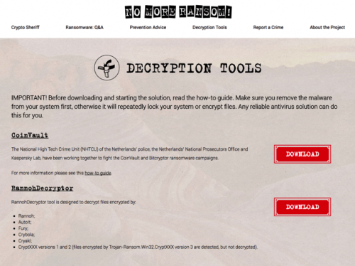 在網(wǎng)站的 Decryption Tools 解密工具頁(yè)面,提供一系列可協(xié)助處理、還原或救援被勒索病毒加密后檔案的工具(CoinVault、RannohDecryptor、RakhniDecryptor、ShadeDecryptor),都有各自對(duì)應(yīng)可以處理的勒索病毒副檔名格式。