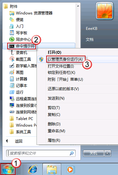 在開始菜單中,依次打開“所有程序>附件>命令提示符”。在“命令提示符”上右擊鼠標,選擇“以管理員身份運行”