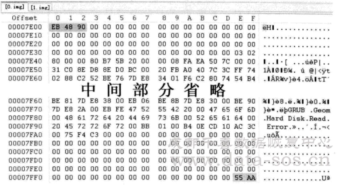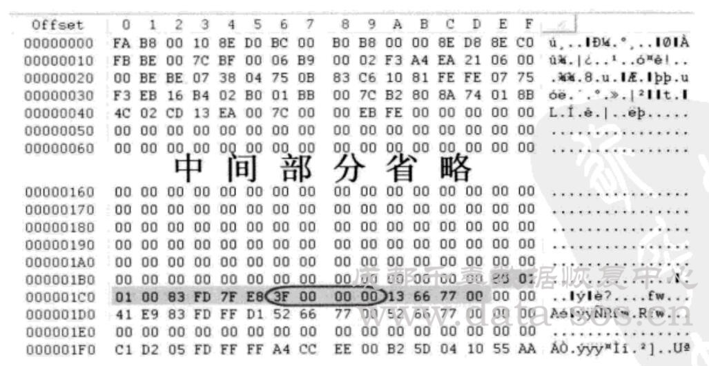 硬盤0的第一個扇區(qū)是MBR,其第一個分區(qū)表項(xiàng)描述了分區(qū)開始位置為63,跳轉(zhuǎn)到 63號扇區(qū),內(nèi)容如下圖所示。