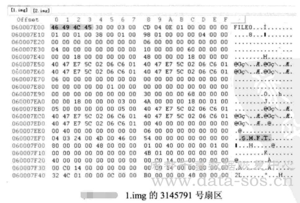 從上圖的BPB參數(shù)中能夠知道該文件系統(tǒng)每簇扇區(qū)數(shù)為8, $MFT文件的開始簇 號為786432,所以吋以計算出$MFT文件在該邏輯卷中的扇區(qū)號為786432*8=6291456,而該RAID是由兩塊物理盤組成的,所以$MFT文件在物理盤中的開始扇區(qū)大致為 (6291456/2) +63=3145791。跳轉(zhuǎn)到l.img的3145791號扇區(qū),果真是$MFT文件的開始, 如下圖所示。