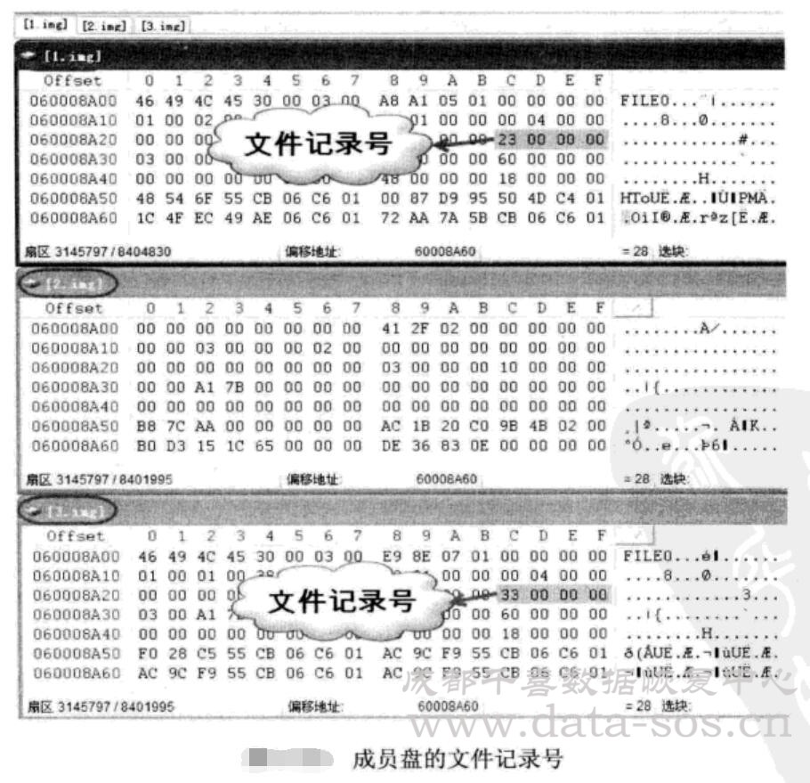 還用上圖中的例子來說,從這3塊成員盤的文件記錄中,還可以看到它們的文件記錄號,如下圖所示