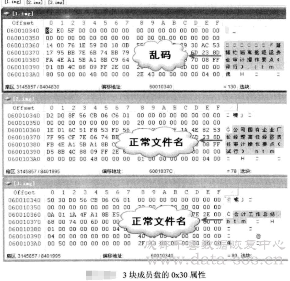下面通過實例說明,一個3塊成員盤組成的RAID-5,同時跳轉(zhuǎn)到3塊成員盤的3145797 號扇區(qū),這是$MFT的文件記錄部分,它們的0x30屬性如下圖所示。