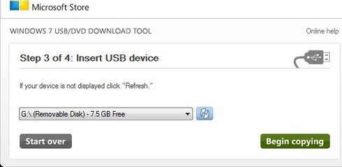 這個畫面是U盤已經(jīng)被成功識別,如果沒有檢測出來,點選設(shè)備下拉菜單選項后面的刷新圖標(biāo)可以進(jìn)行刷新檢測,一般狀況下可以正常識別出來,選擇您需要制作為安裝盤的U盤,點擊右下角的Begin Copying,軟件就開始制作了。