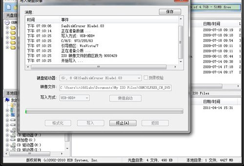 執(zhí)行“寫入硬盤映像”后,在下面的列表中選擇你的U盤,在“寫入方式”一項中提供了USB-HDD、USB-ZIP、USB-HDD+和 USB-ZIP+四種模式,其中兩個帶加號的為UltraISO開發(fā)的最新的提高啟動兼容性的增強模式,推薦大家優(yōu)先使用,如果不行再換用其他兩個不帶加 號的模式。選擇完成后,點擊“寫入”。