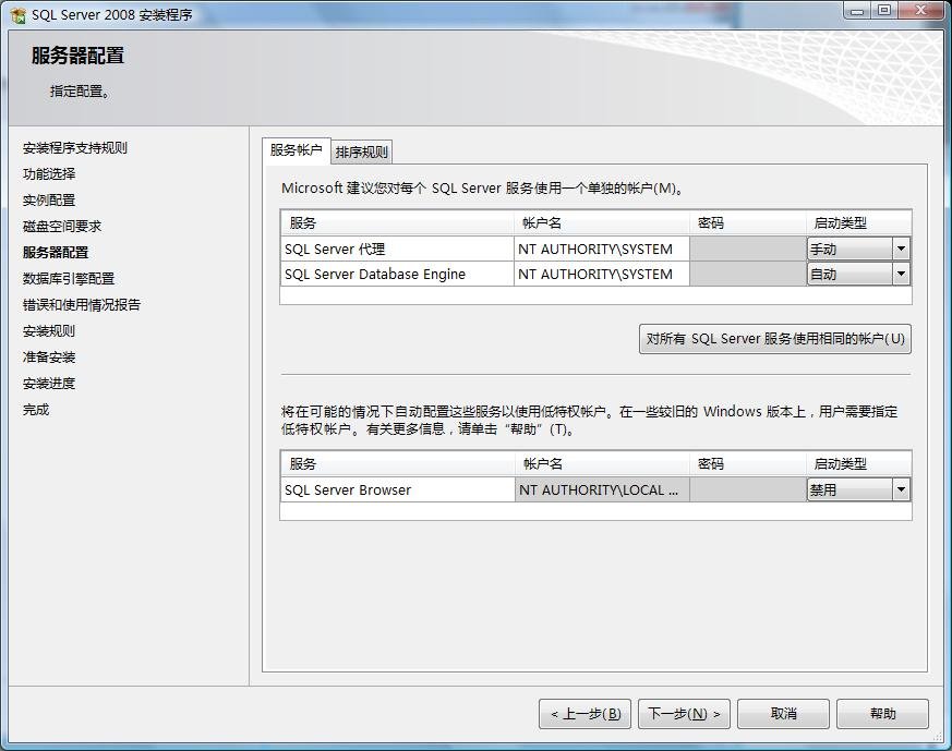 4.服務(wù)器配置,服務(wù)器配置主要是服務(wù)啟動(dòng)帳戶的配置,服務(wù)的帳戶名推薦使用NT AUTHORITYSYSTEM的系統(tǒng)帳戶,并指定當(dāng)前選擇服務(wù)的啟動(dòng)類型,如圖