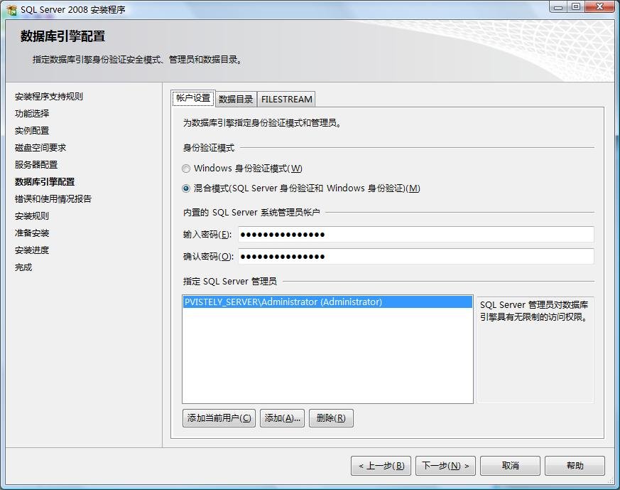 5.數(shù)據(jù)庫(kù)引擎配置,在當(dāng)前配置中主要設(shè)置SQL登錄驗(yàn)證模式及賬戶密碼,與SQL的數(shù)據(jù)存儲(chǔ)目錄,身份驗(yàn)證模式推薦使用混合模式進(jìn)行驗(yàn)證,在安裝 過(guò)程中內(nèi)置的SQL Server系統(tǒng)管理員帳戶(sa)的密碼比較特殊,SQL2008對(duì)SA的密碼強(qiáng)度要求相對(duì)比較高,需要有大小寫字母、數(shù)字及符號(hào)組成,否則將不允許你 繼續(xù)安裝。在”指定Sql Server管理員”中最好指定本機(jī)的系統(tǒng)管理員administrator。如圖