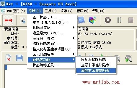 這一步是非常必要的,非常駐缺陷表出現(xiàn)錯誤是前好后壞的元兇之一。清除非常駐缺陷表用MRT或者用PC3000 UDMA都可以完成。其中PC3000 UDMA清除非常駐缺陷表的菜單在“Tests -> Defect lists -> Clearing Non Resident GList”里面。而MRT的清除非常駐缺陷表菜單在“診斷 -> 缺陷表功能 -> 清除非常駐缺陷表”里面,如下圖所示: