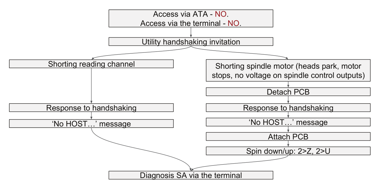 Second one (for drives with diskware) is short after power on and second “SpinUp” message in terminal, and keep shorting until “NO HOST FIS” message appeared after power on trying to reach terminal by Ctrl Z