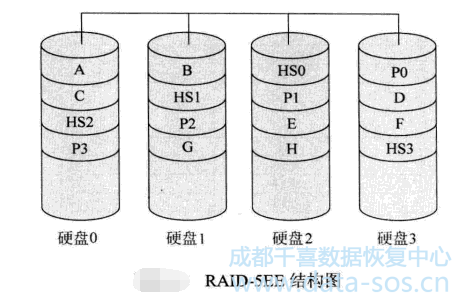 RAID-5EE中數(shù)據(jù)的分布與RAID-5相比,每個(gè)條帶組中多出一個(gè)熱備塊,如圖中的HSO、HS1、HS2、HS3就是熱備塊。