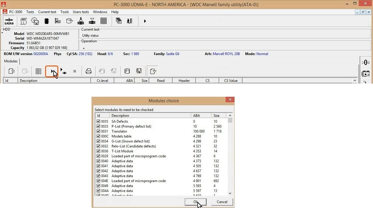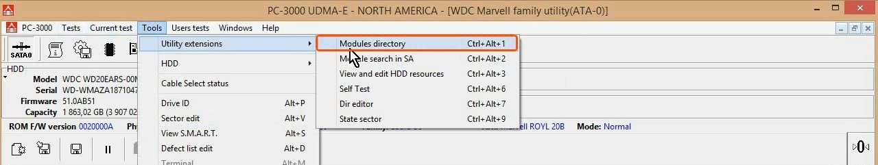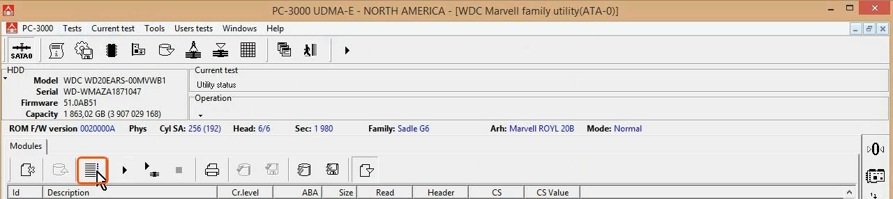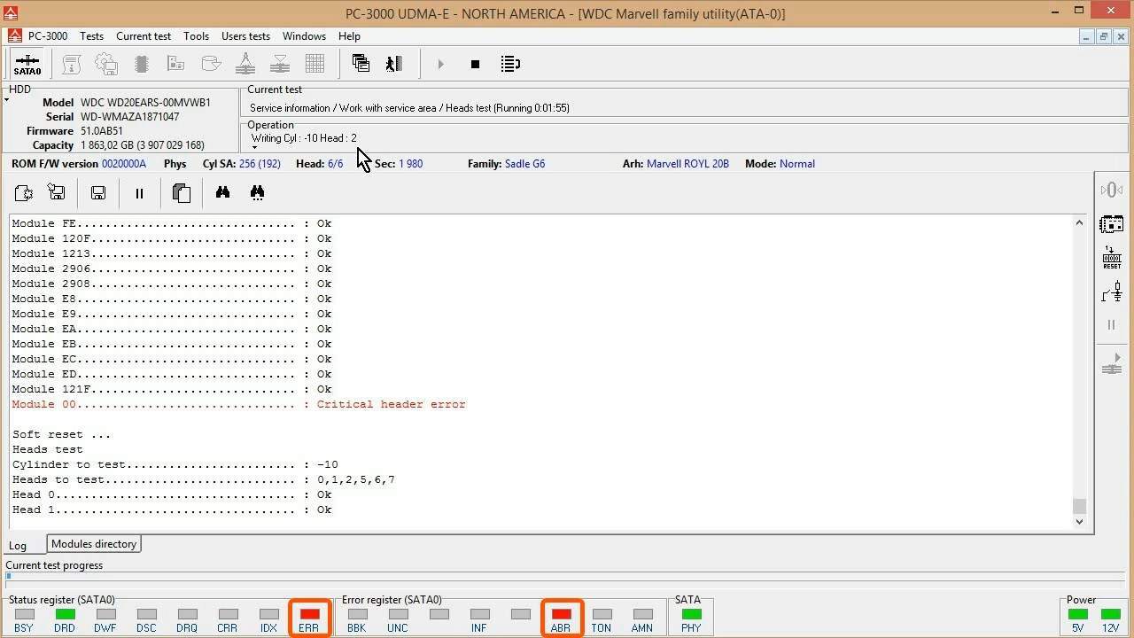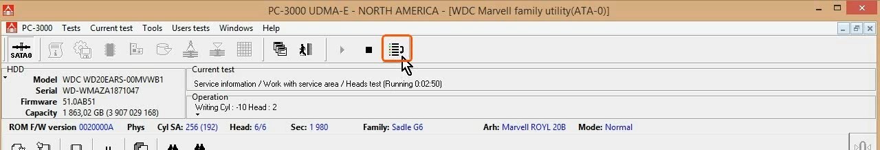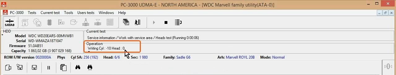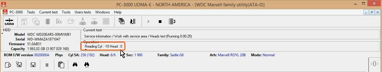 In this example we recover WD20EARS-00MVWB0 drive with non-system head damaged. The drive goes READY but do not give access to its User Area. So we use the procedure in Normal mode.
