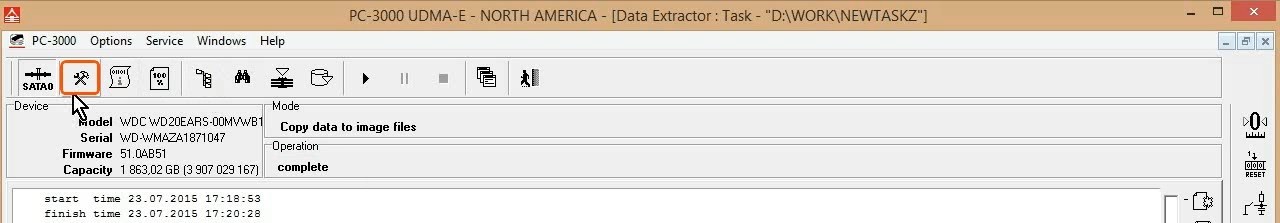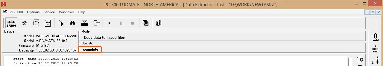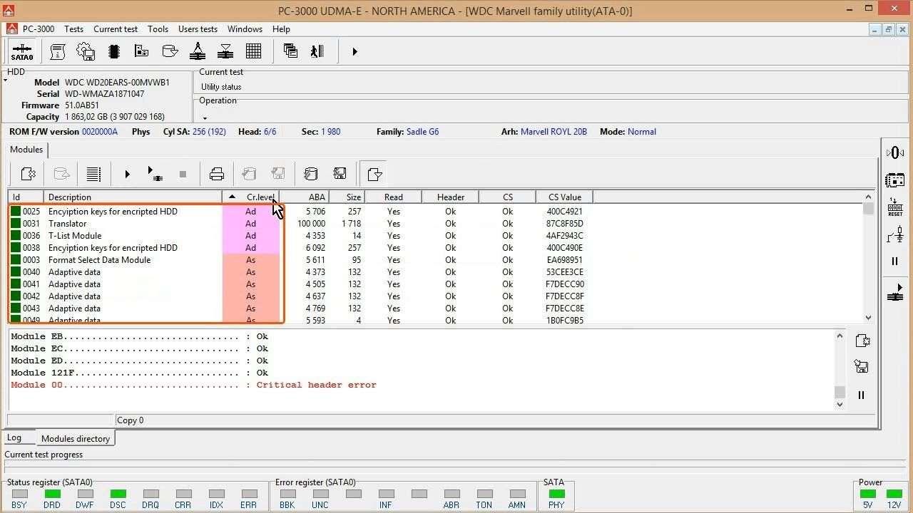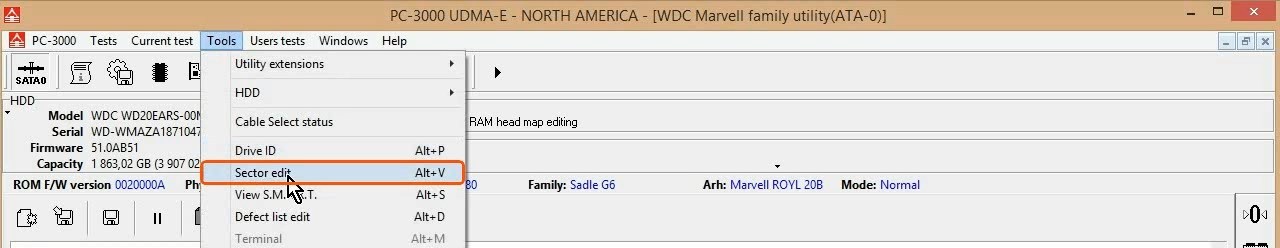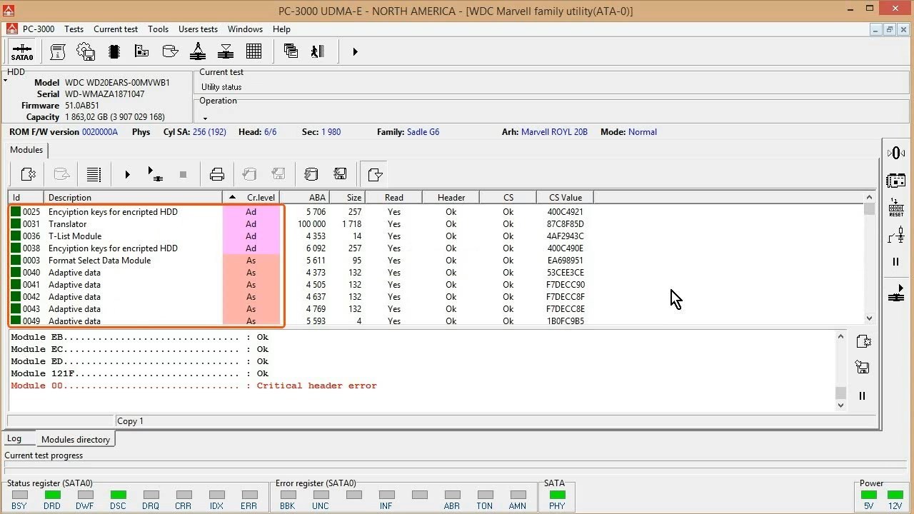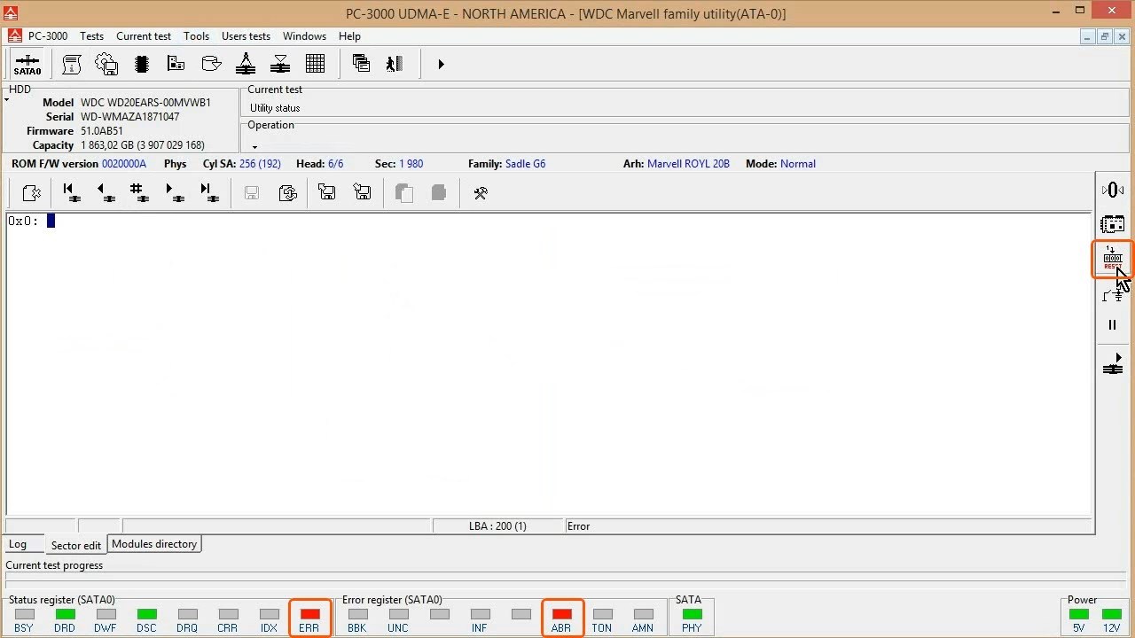 In this example we recover WD20EARS-00MVWB0 drive with non-system head damaged. The drive goes READY but do not give access to its User Area. So we use the procedure in Normal mode.