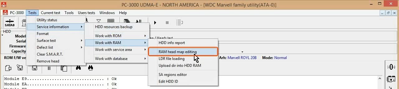 To do that we go to Tests -> Service information -> Work with RAM -> RAM head map editing