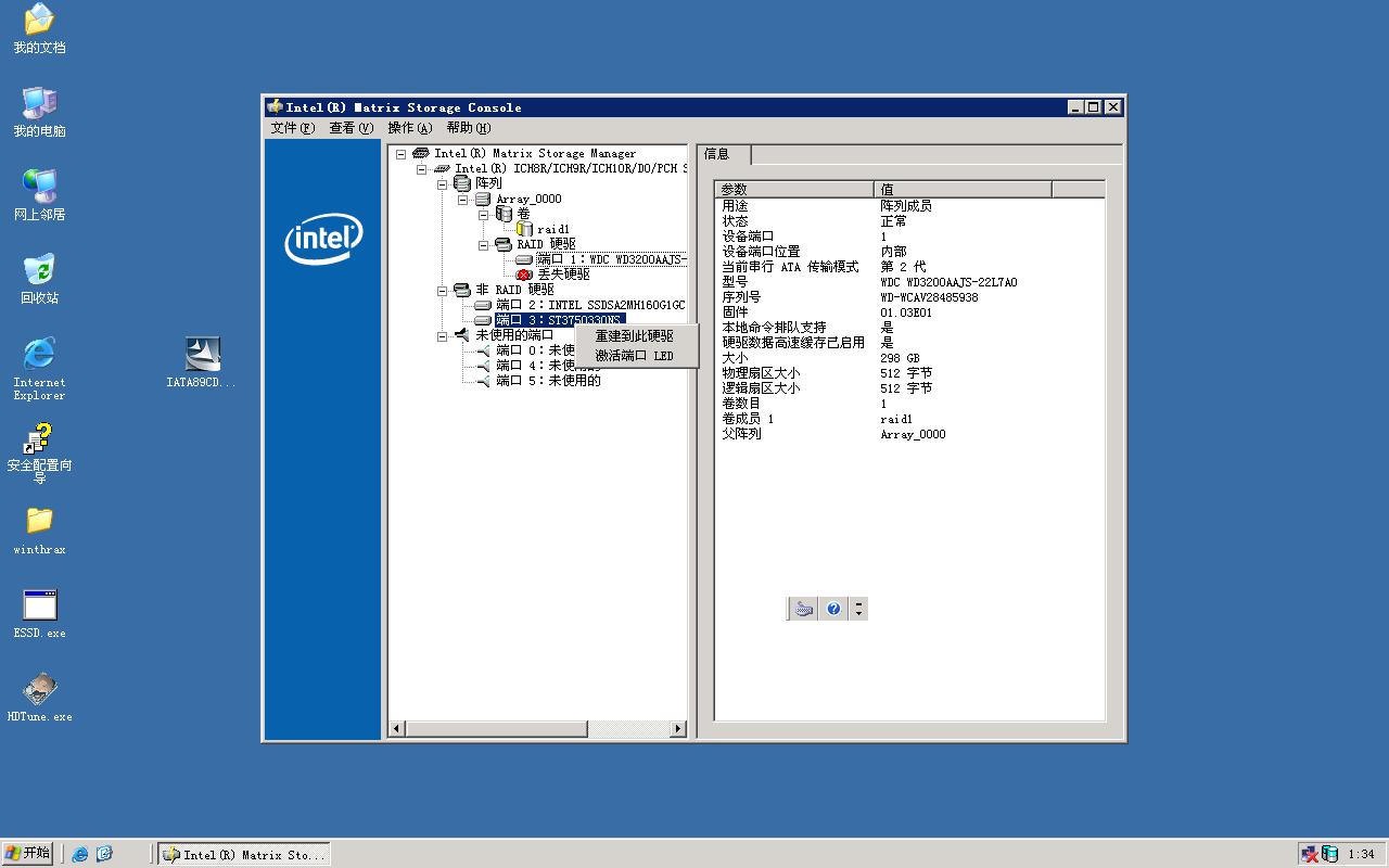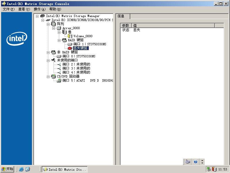 如果更換新的硬盤,原有槽位還是提示丟失,但新加的硬盤在別處可檢測到,可采用手工的方式進(jìn)行重建,在硬盤上單擊右鍵,選擇重建到此硬盤(或選擇標(biāo)記為正常后會自動同步)