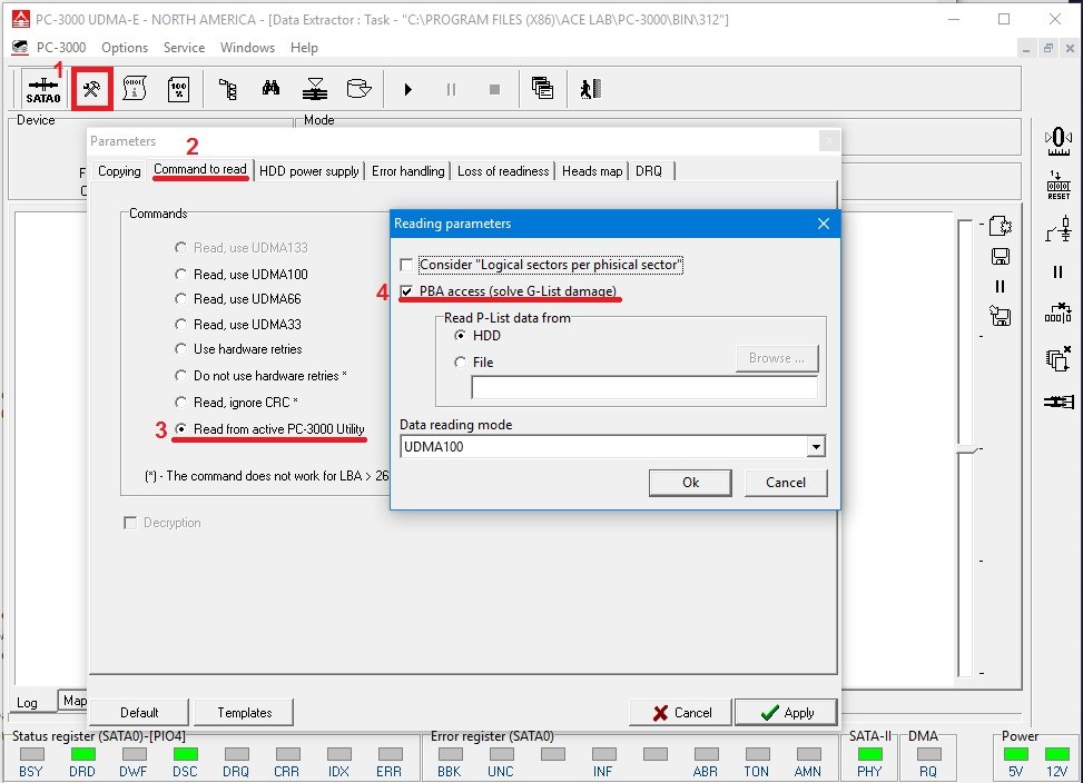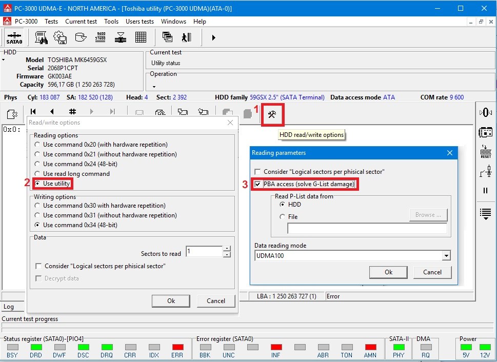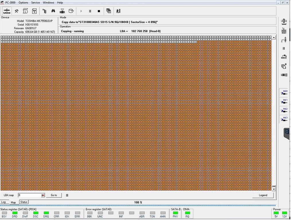 Connect the drive to PC-3000, don’t forget to connect a Terminal adapter.