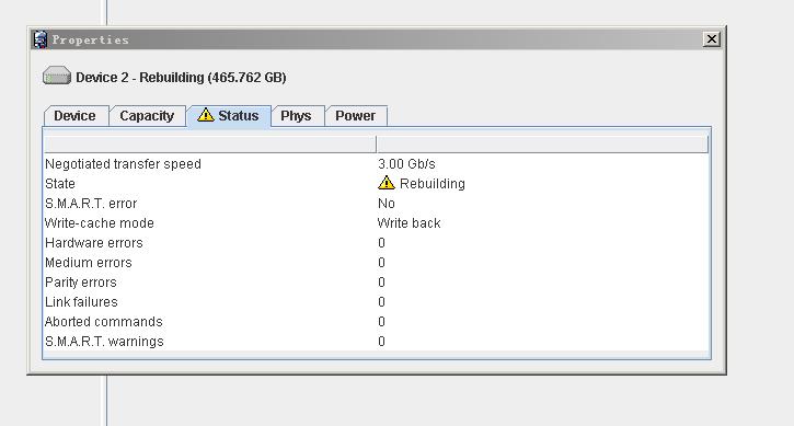10.下圖是硬盤掉線后在主界面下的表現(xiàn),硬盤掉線后raid卡會報警,此報警音可以選擇菜單欄中silence關(guān)掉,并且可以雙擊對應(yīng)物理磁盤,查看屬性中無憂media error之類的報錯,如下圖