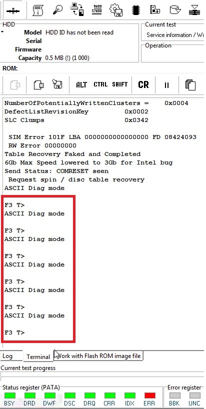 As you can see the Terminal mode is now available and ready to receive and execute your commands. Note that the drive is not fully initialized, and in registers you can see a different LEDs. Don’t pay attention to these LEDs for now. Drive is not available via ATA, and we have only a terminal mode, but we can perform any diagnostics with general HDD: like?check a system files by Ctrl+X command, make a manual backup of important system files (28, 35, 93, 1B, 135 etc), regenerate a Translator (if needed!),?remove a ticks in 93 sys file (SMP flags)?and other.