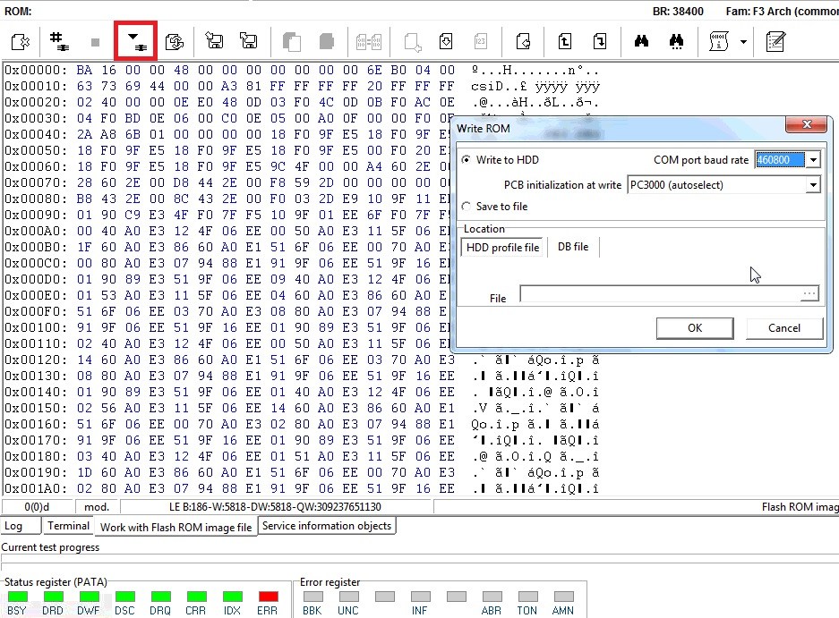 After completing NAND reinitialization you need to write back the original ROM dump (that you did not forget to backup, didn’t you?). Open this ROM.bin file from backup profile folder: