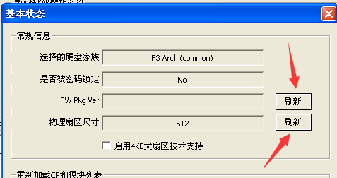 虛擬啟動成功后,硬盤會就緒,在就緒狀態(tài)下,點(diǎn)擊菜單“診斷 -> 基本狀態(tài)”,然后刷新下固件信息和物理扇區(qū)信息,刷新成功就能在DE中正常分頭了。注意一定要刷新下這兩項(xiàng)信息,否則進(jìn)了DE也無法正常分頭的。如圖所示:
