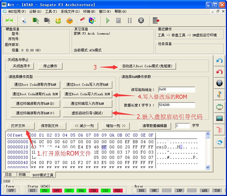 3、打開菜單“工具 -> BOOT模式工具”,然后打開原始ROM文件,再將虛擬啟動引導(dǎo)代碼內(nèi)嵌到ROM中。然后用BootCode將ROM寫入硬盤。如下圖:
