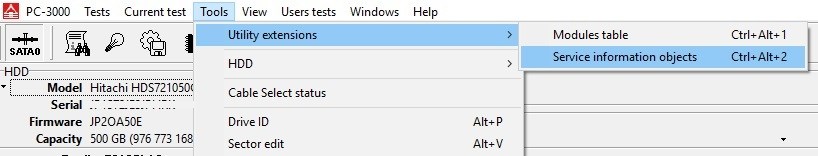 First of all, we check whether all important modules have been uploaded into the NV-RAM. To do that we go to Tools->Utility extensions->Service information objects: