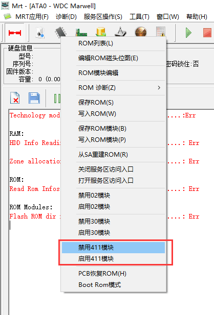 常規(guī)方法有關(guān)閉服務(wù)區(qū)入口或者添加服務(wù)區(qū)缺陷,然后加載LDR來獲取硬盤服務(wù)區(qū)的正常讀寫權(quán)限;也可以使用“禁用02模塊”功能,獲取硬盤服務(wù)區(qū)的讀寫權(quán)限。但是這些方法都各有其局限性。比如,有的硬盤LDR很難找;然后在很多新的硬盤上,“禁用02模塊”無法有效的達(dá)到正常讀寫服務(wù)區(qū)的效果。這個時候就需要使用我們的新功能“禁用411模塊”了。巧用這個模塊,修復(fù)新西數(shù)硬盤的固件問題時能夠事半功倍。