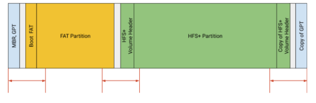 - the HFS+ partition almost immediately follows the FAT32 partition, and its beginning contains the HFS+ Volume Header – the entry point to the HFS+ file system;