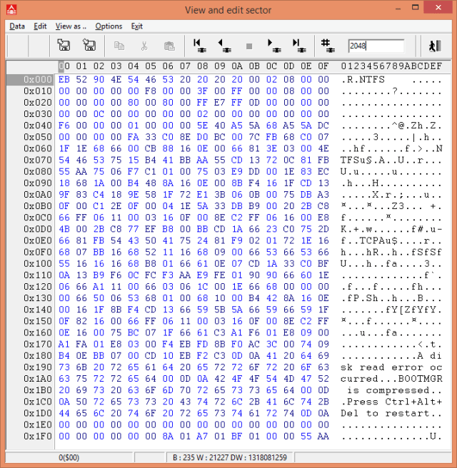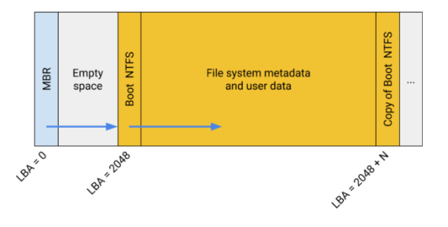 讀取分區(qū)的扇區(qū)0并在那里找到NTFS引導(dǎo)結(jié)構(gòu),以了解我們處理的是NTFS文件系統(tǒng),因此我們可以獲得關(guān)于它的元數(shù)據(jù)的一些信息。