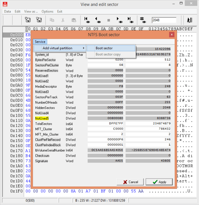 When we open sector 2048, we see the signature, typical for Boot NTFS – the “NTFS” line at the beginning of the sector. Let’s use the option of viewing the sector as a Boot NTFS structure (View as…> Boot NTFS), and see that the relevant fields are valid. Then we add a virtual partition from the “Service” menu.