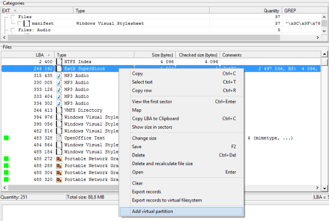 These options are the basis for the method of adding a virtual partition that is available from the context menu on ExtX Superblock.