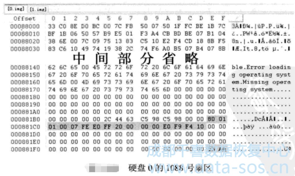 接下來(lái)將硬盤(pán)1也轉(zhuǎn)向1088號(hào)扇區(qū),其內(nèi)容如圖所示。