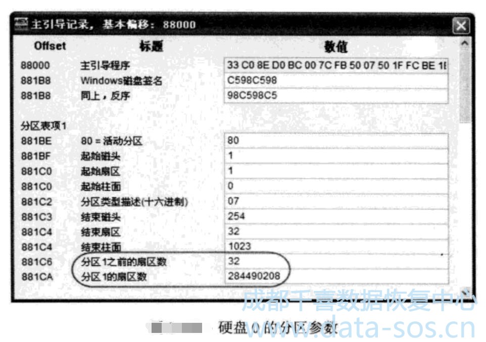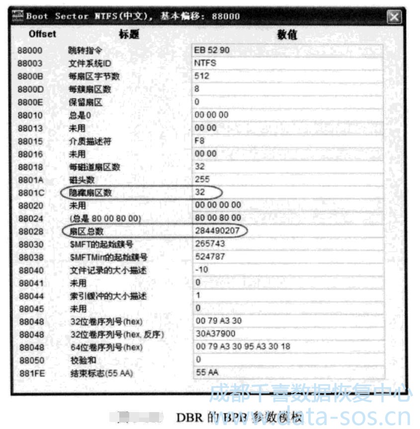 BPB參數(shù)中“隱藏扇區(qū)數(shù)”的值等于32,這跟分區(qū)表中描述的分區(qū)開(kāi)始扇區(qū)號(hào)相符;BPB參數(shù)中“扇區(qū)總數(shù)”的值等于284490207,比分區(qū)表中描述的分區(qū)總扇區(qū)數(shù)少1,這也符合NTFS文件系統(tǒng)的特征,說(shuō)明這個(gè)DBR也是當(dāng)前RAID-0邏輯卷的有效DBR。