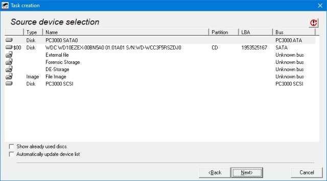 The PC-3000 Data Extractor software allows you to work with different source devices: