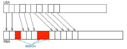 In practice, the logical access (LBA) takes into account the translation of sectors and skips defects (hidden in the defect lists).
