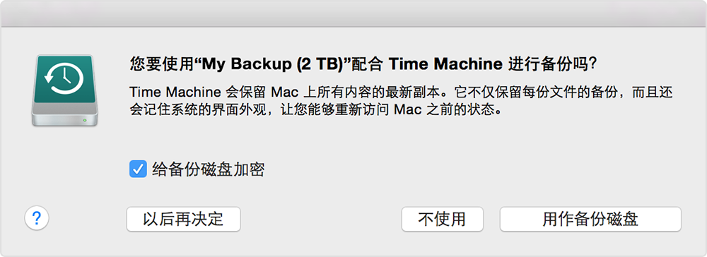 將外置驅(qū)動器直接連接到 Mac 時,系統(tǒng)可能會詢問您是不是要通過“時間機器”將這個驅(qū)動器用于備份。請選擇“給備份磁盤加密”(推薦),然后點按“用作備份磁盤”。