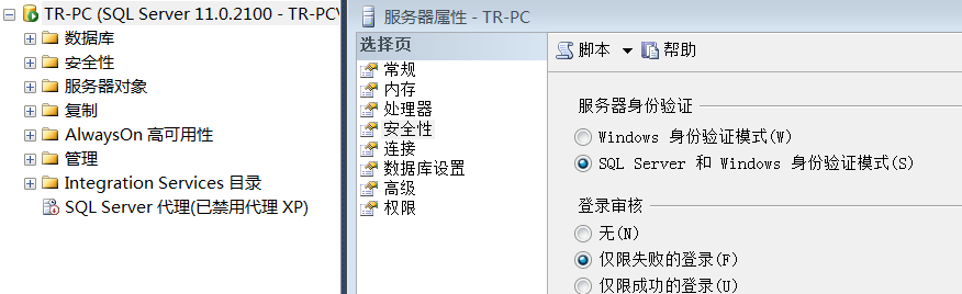 2.右擊對(duì)象資源管理器中服務(wù)器→屬性→安全性→SQL Server和Windows身份驗(yàn)證模式