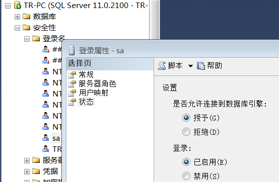 3.對(duì)象資源管理器中服務(wù)器 安全性→登錄名→雙擊sa→常規(guī):取消強(qiáng)制實(shí)施密碼策略+重設(shè)密碼;狀態(tài):授予+已啟用
