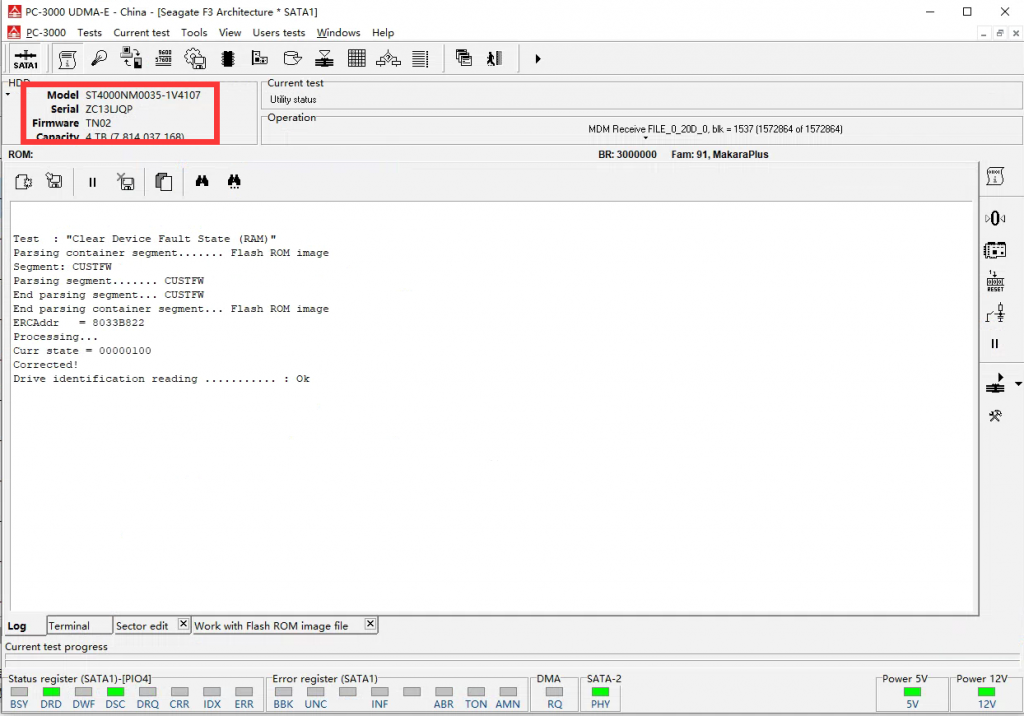 希捷ST4000NM0035硬盤送至千喜成都數(shù)據(jù)恢復中心經(jīng)初步檢測發(fā)現(xiàn)電路板燒壞,更換電路板后發(fā)現(xiàn)磁頭也是損壞的,更換磁頭后發(fā)現(xiàn)不能正常識別硬盤ID,嘗試讀取ID,DWF,ERR,ABR錯誤燈亮起,當然所有扇區(qū)也不能訪問。