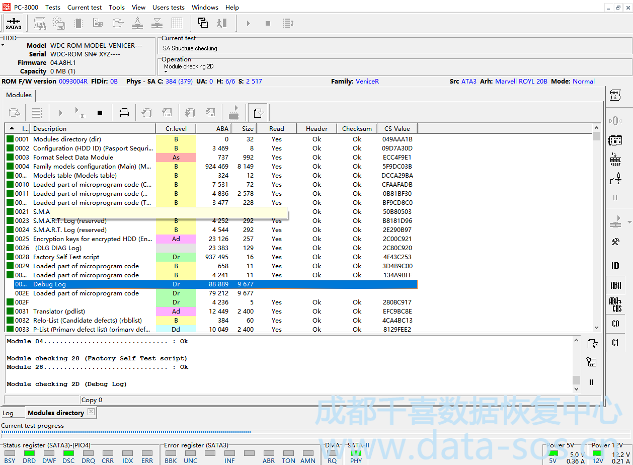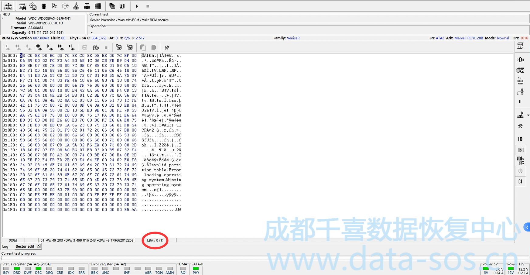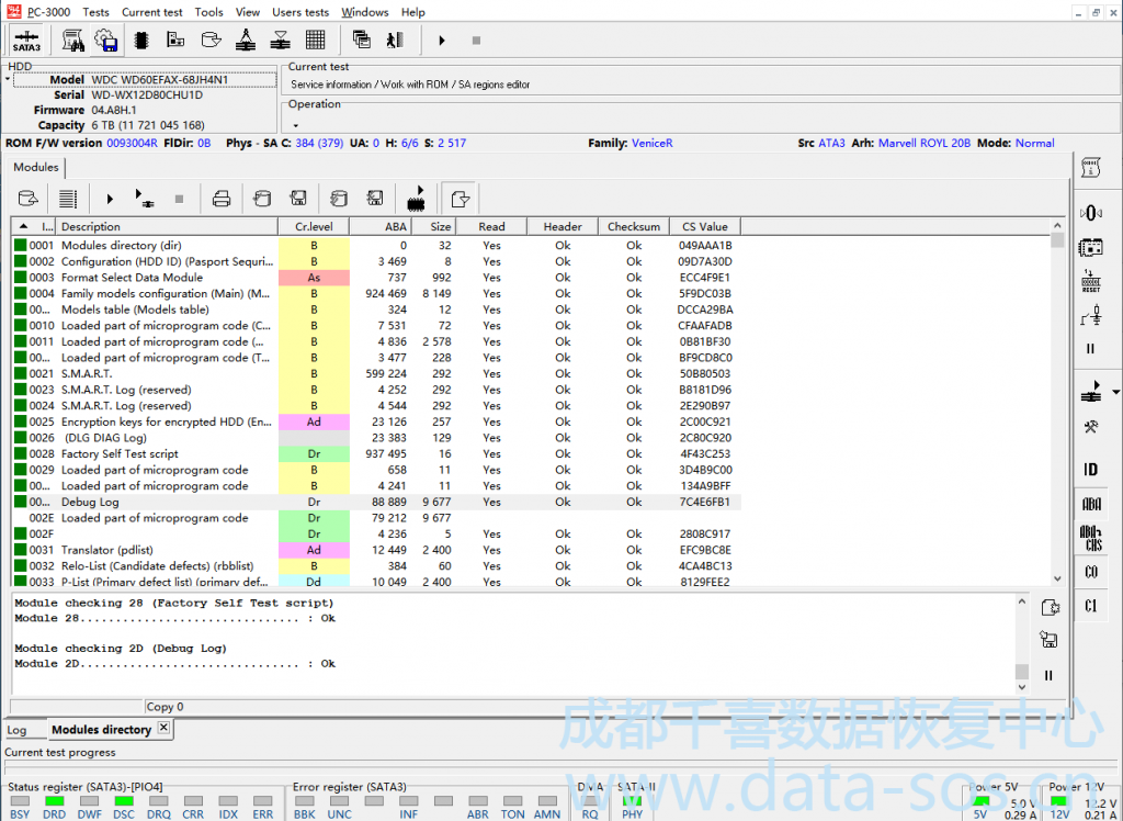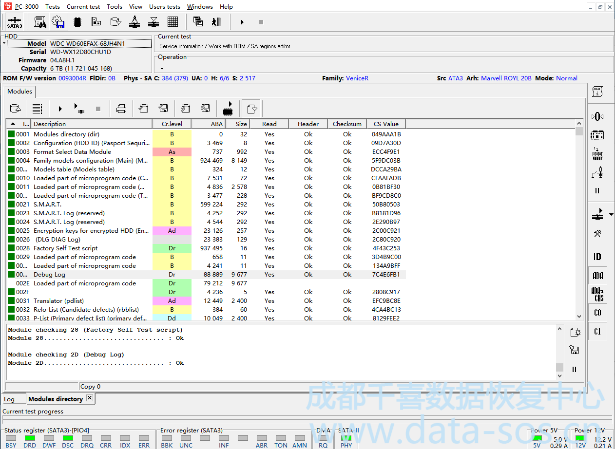 此故障經(jīng)千喜成都數(shù)據(jù)恢復(fù)中心工程判斷懷疑可能是固件損壞引起的,將電路從硬盤盤體拆下后備份ROM及ROM模塊,偏移ROM SA后將電路板安裝回硬盤盤體嘗試加載LDR讀取固件,經(jīng)多次嘗試加載不同F(xiàn)/W的固件后能正常讀取固件,并備份固件。